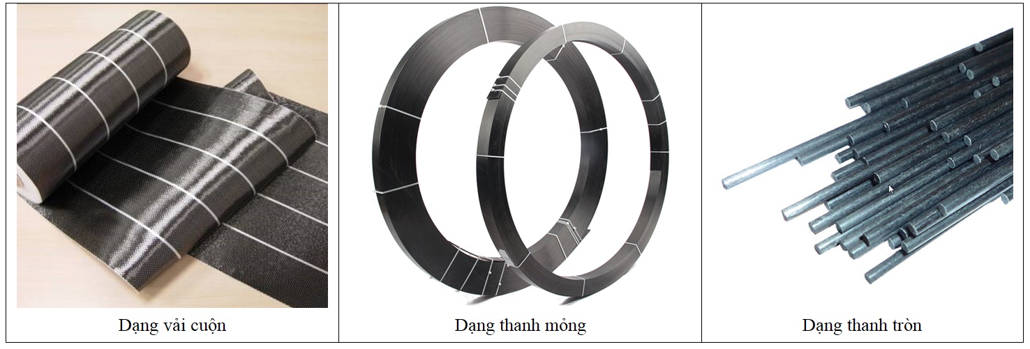 – Các dạng CFRP thường dùng hiện này gồm dạng vải cuộn, dạng thanh mỏng, dạng thanh tròn: